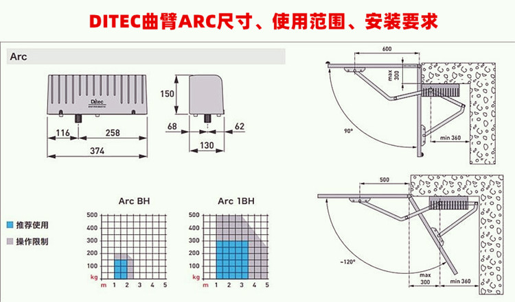 三、意大利DITEC豪华重型机电曲臂式平开门机ARC尺寸及安装要求: